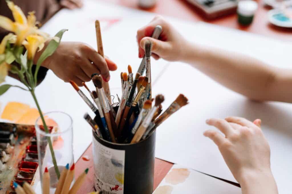 From above of wicker baskets with bouquet of chamomiles and garden scissors with small shovel on green grassy meadow in summer day in countryside